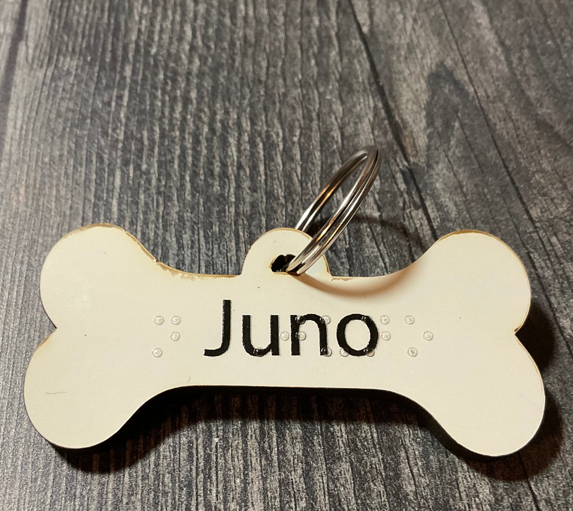 These high quality dog tags are made of MDF and have both print and braille on them.
