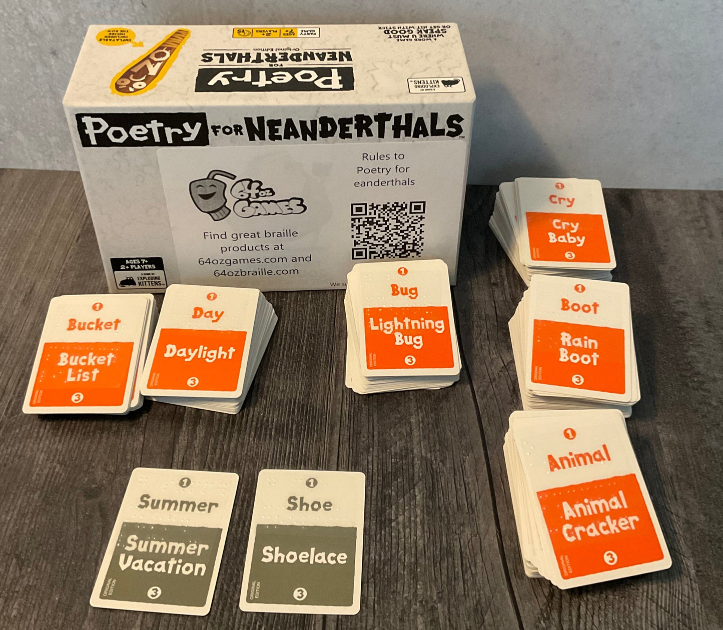 Includes braille to put card titles on cards and reference sheets for complete card text.
